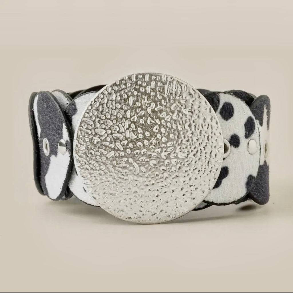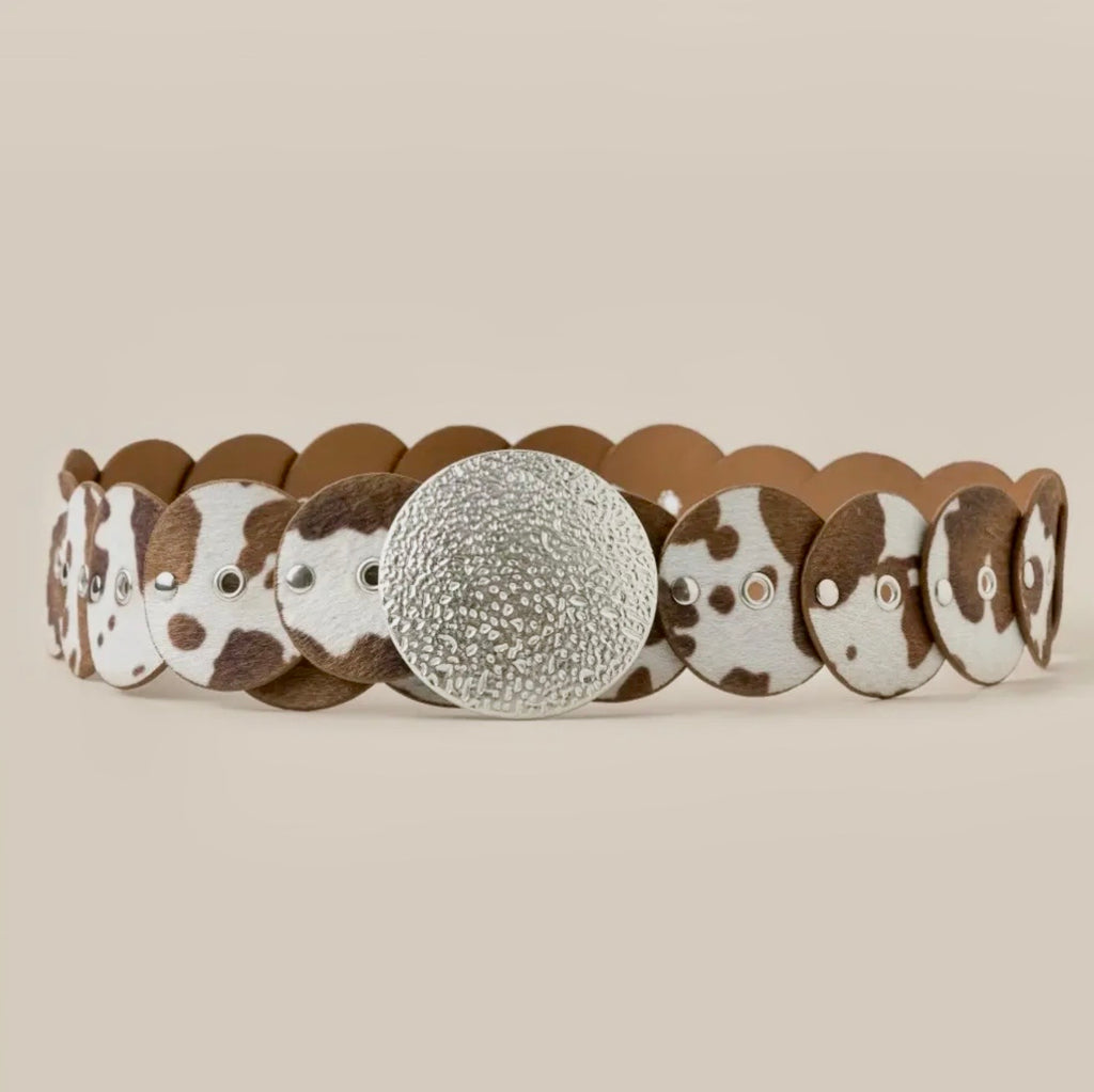 • Effortlessly stylish and always on-trend, this belt incorporates a flawless western inspired faux cowhide large round buckle design.